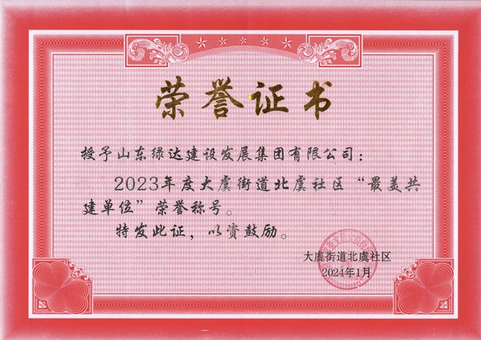 2024年1月10日上午,北虞社區(qū)召開“新征程,再出發(fā)”-2023年度總結暨表彰大會,會上,綠達公司被授予“最美共建單位”榮譽稱號。